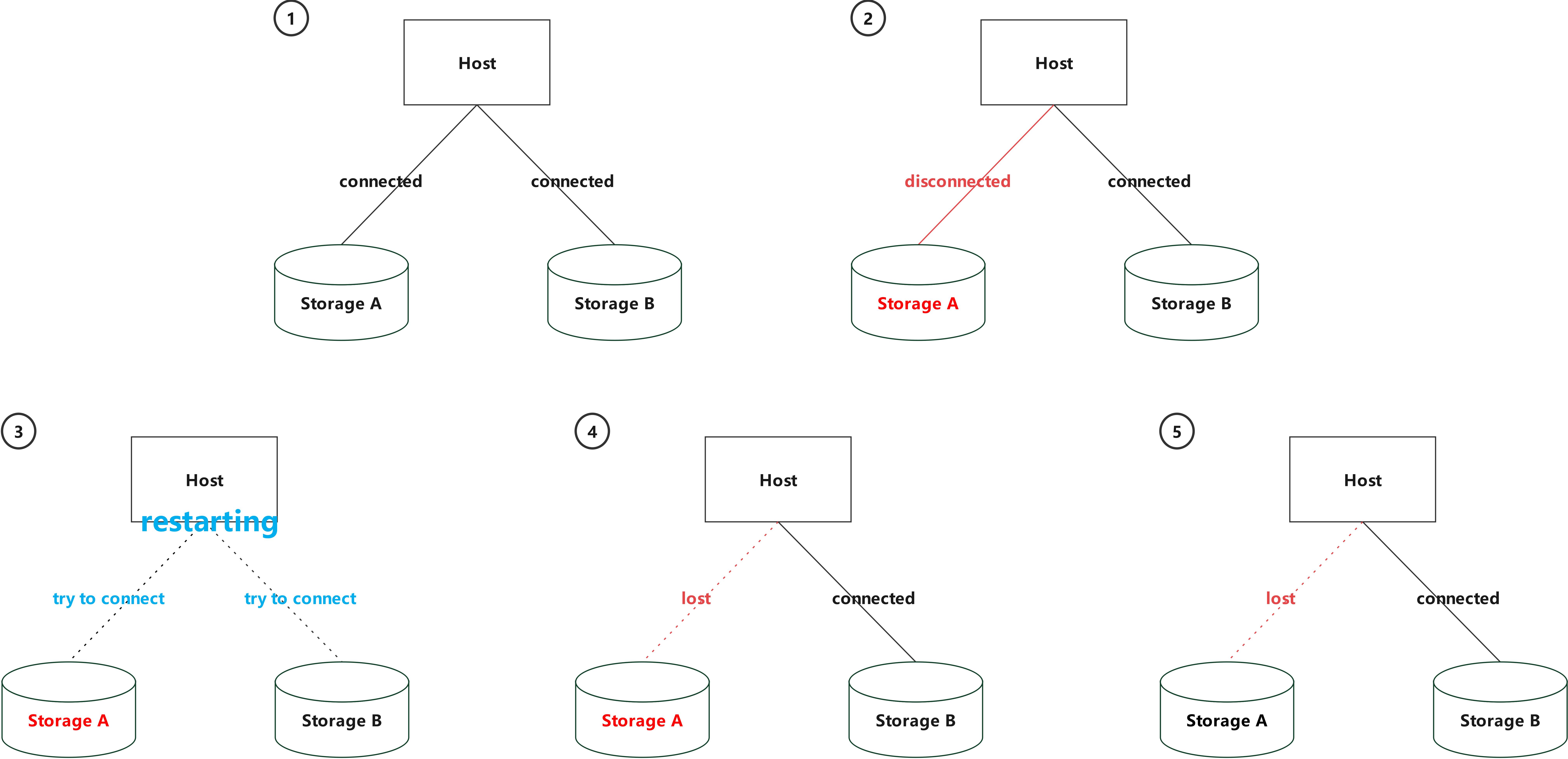 As shown in Figure 1 , if the link between the host and the storage device is disconnected due to factors such as HBA/NIC exceptions, switch/network jitter, or storage array service port faults, the host restarts and triggers disk scanning again. In this case, the link to the faulty storage device is disconnected on the host. After the fault is rectified, the link information is lost after the host scans the disks again. As a result, the lost link will not be automatically restored.